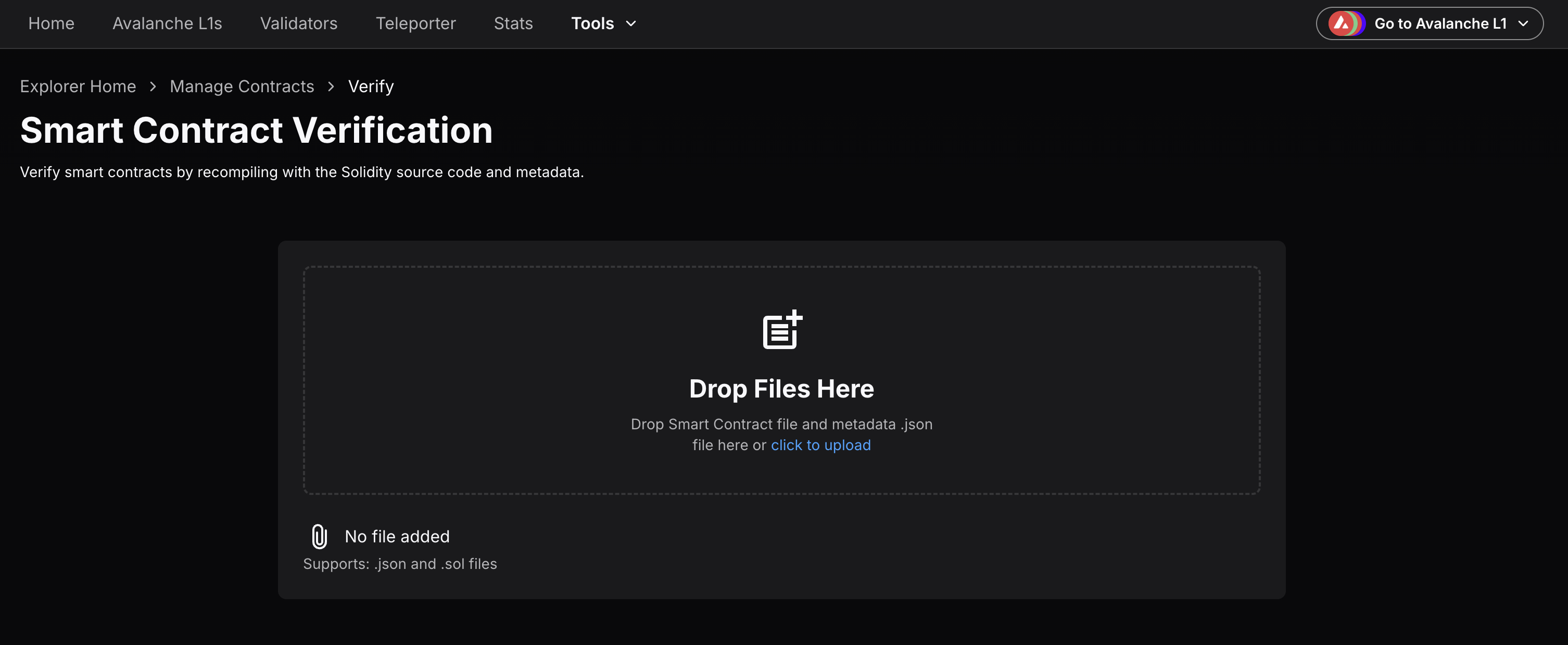 1. Navigate to the official Avalanche Explorer and click on Tools dropdown menu to select Smart Contract Verification interface. You may need to open the Testnet Explorer in case the contract is deployed on Fuji Testnet.
